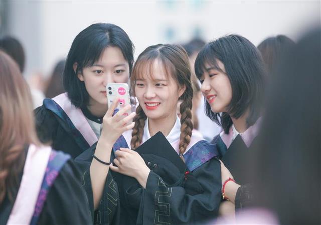 “毕业快乐!”“加油,后浪青年!”“很高兴能陪你们走过这一段,见证你们的青春成长。愿再相遇时,你们仍是少年!”教师们带着深情的祝福,与毕业生一起踏上“彩虹启航路”。师生们手持加油牌合影,并纷纷在签名墙上写下各自的姓名和祝福。