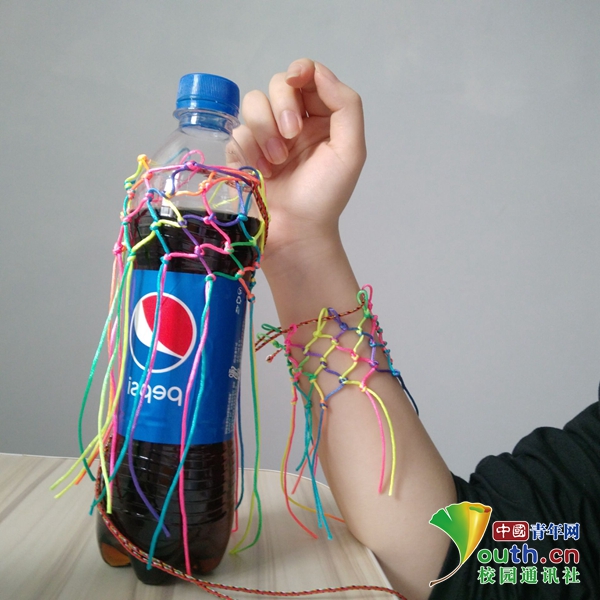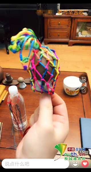 紧接着,王若萱以即将到来的端午节为切入点,将节奏调频至“鸭蛋网兜技法”讲授上。其中,不仅有不同材质、粗细、色泽编织线的鉴别之道,还有利用矿泉水瓶当作绳编支点的实用妙方,更有针对开结、串并、收尾等的针对性细致解说。“王老师下次再教我们新的花样吧!”临近结束,学生们纷纷表示回味无穷,不愿下播。