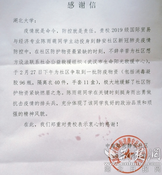 荆楚网消息 “贵校2019级国际贸易与经济专业陈雨萌同学主动投身到静安社区新冠肺炎疫情防控中……充分体现了该同学良好的政治品质和顽强的精神风貌。”4月2日,国产亚洲精品久久久久久久_无码AV免费精品一区二区三区_99久久久无码国产精品免费人妻_精品人妻无码一区二区三区在线_无码专区久久综合久综合字幕_久久精品国产一区二区三区四区_真实一级一级一片免费视频_特级精品毛片免费观看_国产成人无码AA片免费看收到武汉市武昌区中南路街道静安社区发来的感谢信。