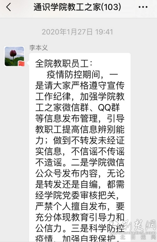 “国内疫情防控形势虽有好转,但国外抗疫形势不容乐观,在此温馨提示大家……”这是通识教育学院教工之家发布的一则消息。学院疫情防控工作专班结合学院实际,细化工作要求,面向师生发布各类通知12条,教育引导教职工管好自己和身边人,对于各类非官方消息严格做到不听、不信、不传,并在第一时间通过电话、微信、QQ等方式将国家、省、市各级有关文件精神传达至每一名师生员工。