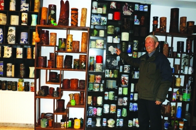赵敬钊教授和他收藏的笔筒。记者郭佳 摄